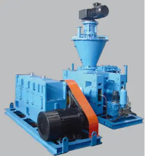 The main structure of the compactor consists of a pair of counter-rotating rollers. One roller is fixed, while the other is a movable roller supported on the frame by a hydraulic system. The surface of the rollers is specially treated to ensure sufficient strength and wear resistance. When the material is continuously fed into or forced into the space between the rollers by a screw feeder, it is compacted into sheets.