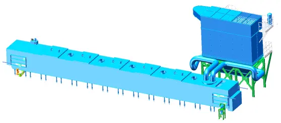 Combustion Section ■ Gas and combustion-supporting air achieve automatic combustion under PLC control. ■ Part of the cold air is mixed with the hot gas after combustion after heat exchange, to fully utilize thermal energy. Drying Section ■ The main body of the drying section is a heavy-duty chain plate dryer. Its basic mechanical movement principle is similar to that of a chain grate, and it can be regarded as a low-temperature chain grate. ■ Material Flow: After passing through the distributor, materials fall into the tail of the upper layer of the dryer, and are discharged from the head of the lower layer in sequence. ■ Crushed Materials: During drying and transportation, some crushed materials fall into the bottom. They are transported to the tail of the lower layer by the chain plate conveyor in the lower layer, and then sent out by the scraper conveyor.This system is a fully enclosed system. ■ Hot Air Flow: Hot air enters the drying chamber through the distribution box. There is a turbulence system inside the drying chamber to realize strong convection of hot air to materials and improve drying efficiency. ■ Materials and hot air are dried through full strong convection exchange.At the same time, the hot air turns into dusty wet air and is discharged.Part of the exhaust gas is returned to the air distribution system of the dryer to fully utilize thermal energy,and the other part is discharged into the atmosphere after passing through the heat exchanger and dust collector. Dust Removal Section It is mainly used to treat the dusty wet air discharged from the dryer. ■ Dry dust removal is adopted when the gas temperature is much higher than the dew point temperature. ■ Dynamic wave wet dust removal is adopted when the gas temperature is lower than or close to the dew point temperature. Heat Exchange Section ■ Generally, no heat exchanger is needed when wet dust removal is adopted. ■ The heat exchanger is also not required when dry dust removal is adopted but the exhaust gas temperature is low.